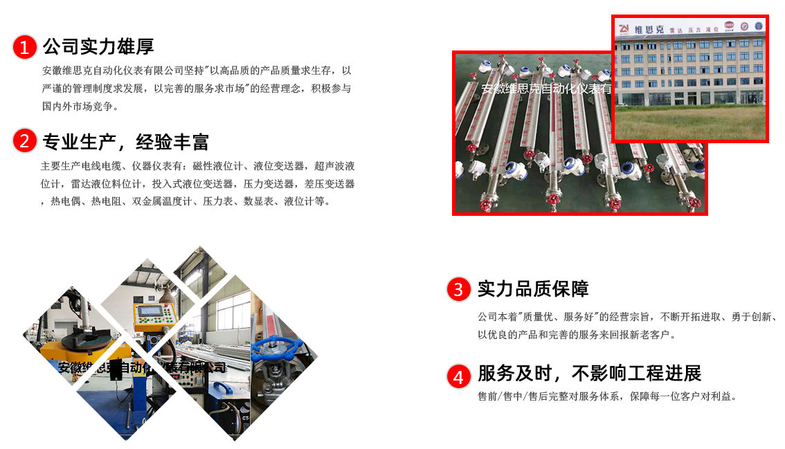 安徽維思克自動(dòng)化儀表有限公司擁有好的生產(chǎn)設(shè)備和檢測(cè)設(shè)備。主要生產(chǎn)電線(xiàn)電纜、儀器儀表有:磁性液位計(jì)、液位變送器,超聲波液位計(jì),雷達(dá)液位料位計(jì),投入式液位變送器,壓力變送器,差壓變送器,熱電偶、熱電阻、雙金屬溫度計(jì)、壓力表、數(shù)顯表、液位計(jì)等。廣泛用于冶金、電力、石油、化工、汽車(chē)、造紙、煤礦、造船、港口、起重、建材、制藥、交通、國(guó)防、城市建設(shè)等領(lǐng)域。